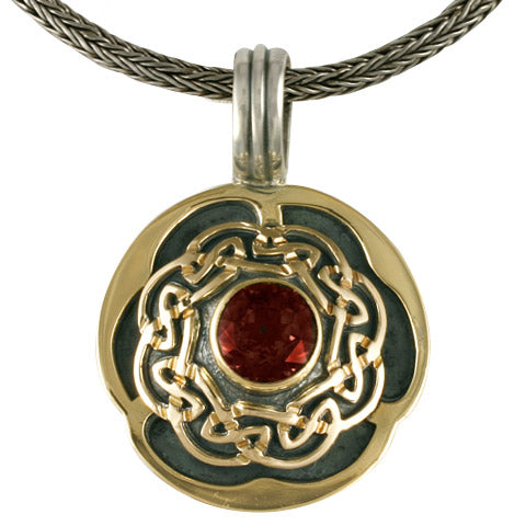 The Helios Pendant features a dramatic design of an intricate circular scroll motif around a faceted Garnet. This is a classic and definitely large enough to make a statement.